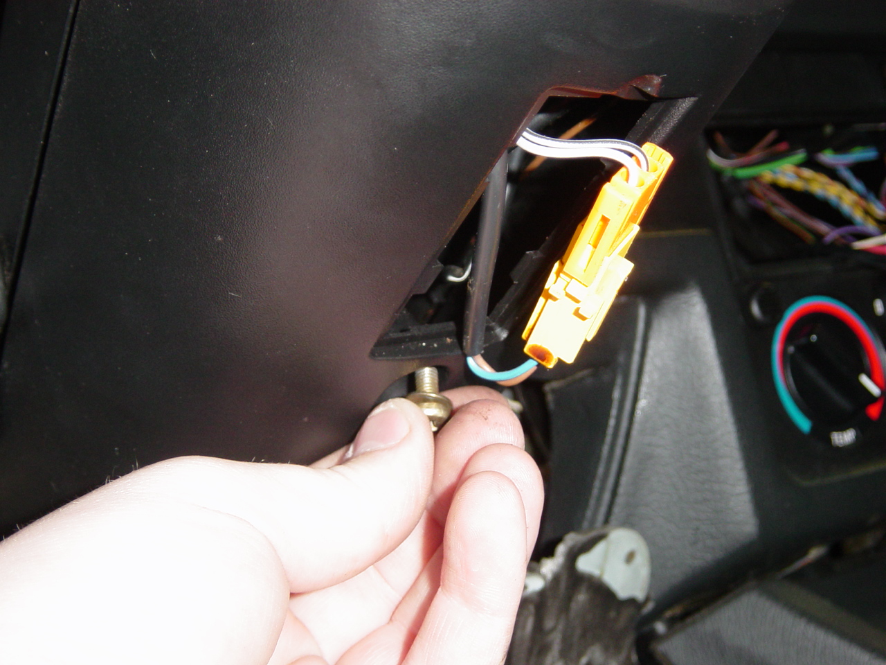 Then remove the screws that hold in the knee bolster. See the