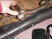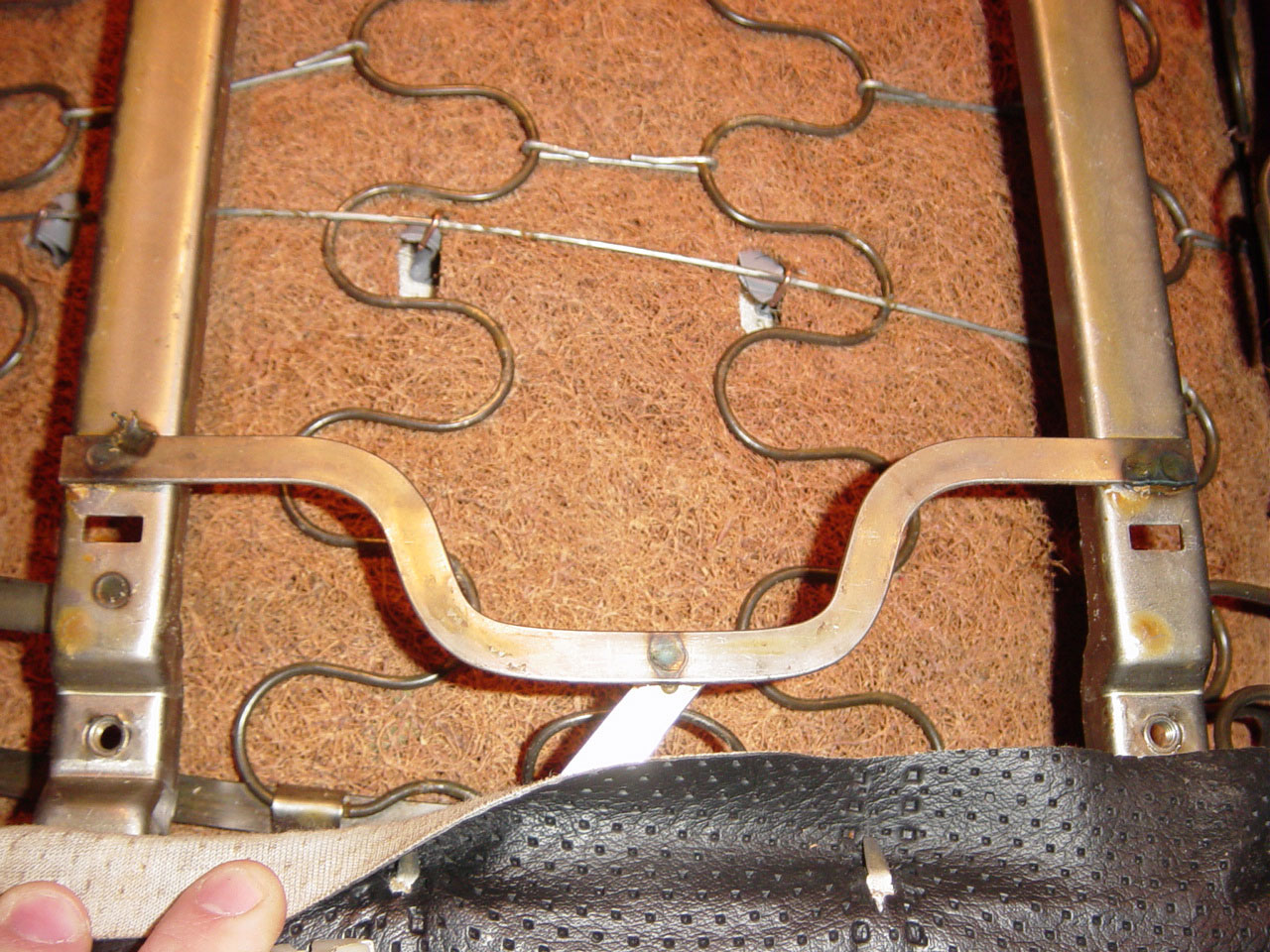 Here is a picture with one side done. Do the other now. Do your hands hurt yet? You may notice that the holes made in the top material of the rear seat don't exactly line up with the holes you cut through the vinyl. Aren't you glad you just didn't cut holes in the vinyl right in the middle of the pre-cut out holes (see picture 4)! |
