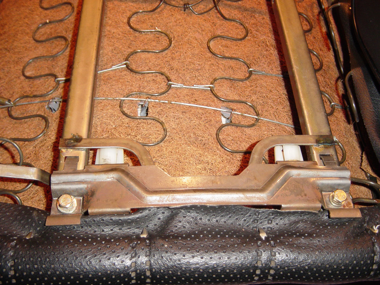 Bolt the mounting bracket to the rear seat. You will need to pierce the vinyl where the legs escape. |