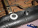 Take the hole dressing and place it in the hole you created. You may have to cut a bit more material away. The black hole dressing part has ridges in it and the white nylon washer clicks on holding the black pieces in place. Use a screwdriver to really push the washers in place. |