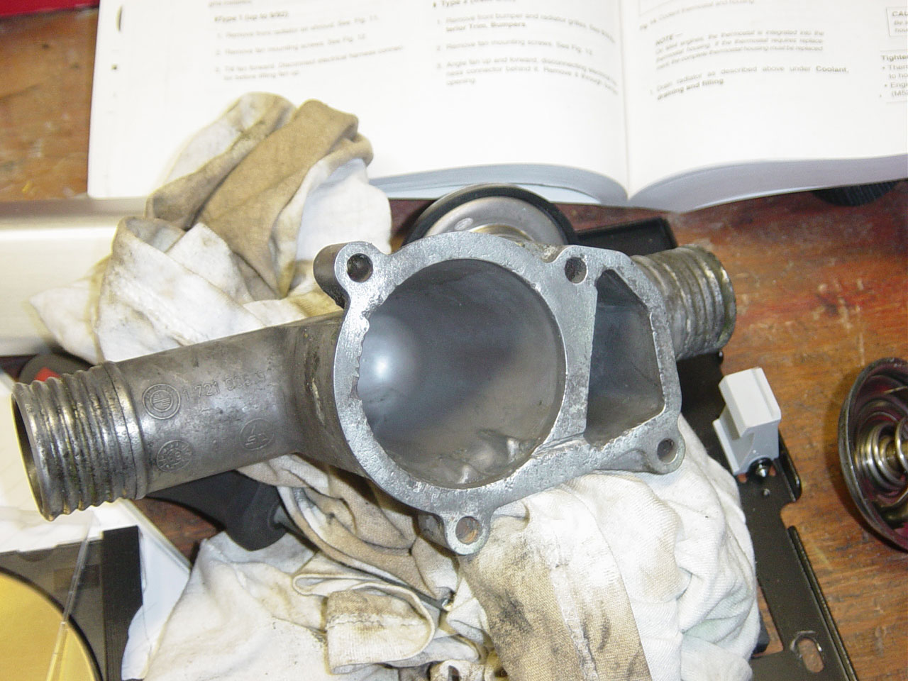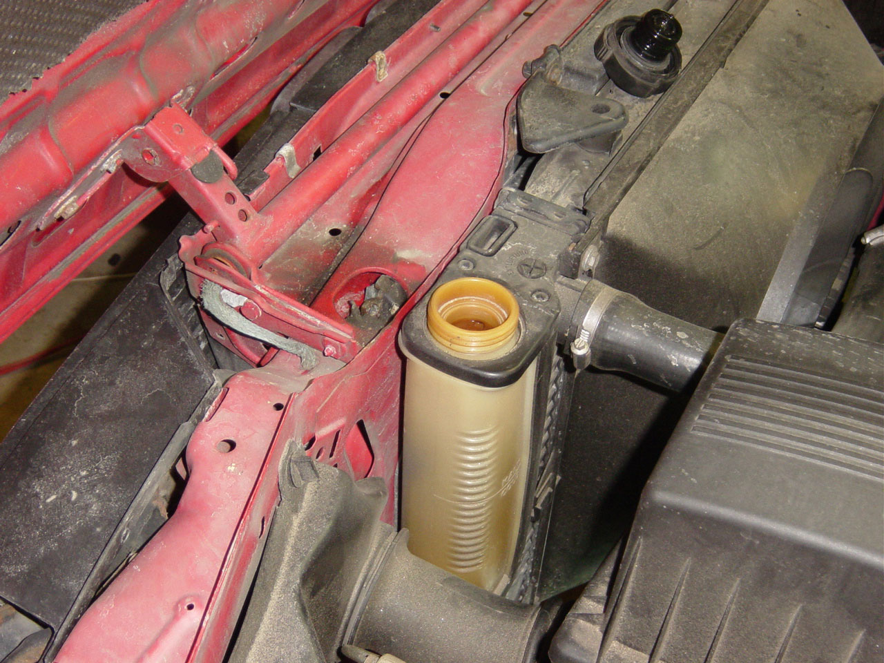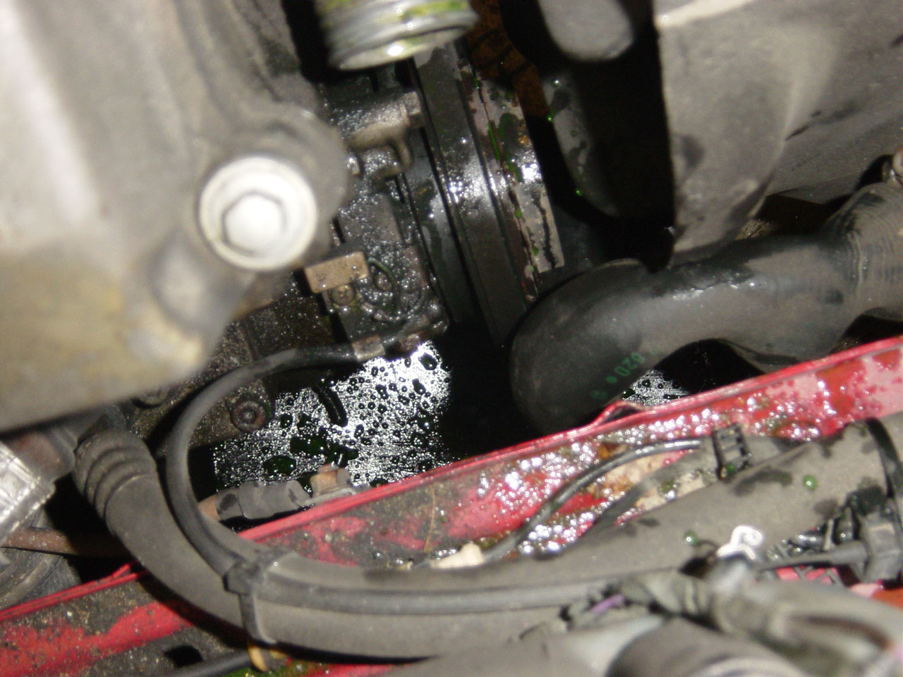 This picture is great. It shows a couple of things. First, the previous owner put the green crap in the car, not the good blue BMW coolant. I really should have flushed my system but it was far below freezing outside and I wasn't about to flood my inside workspace.