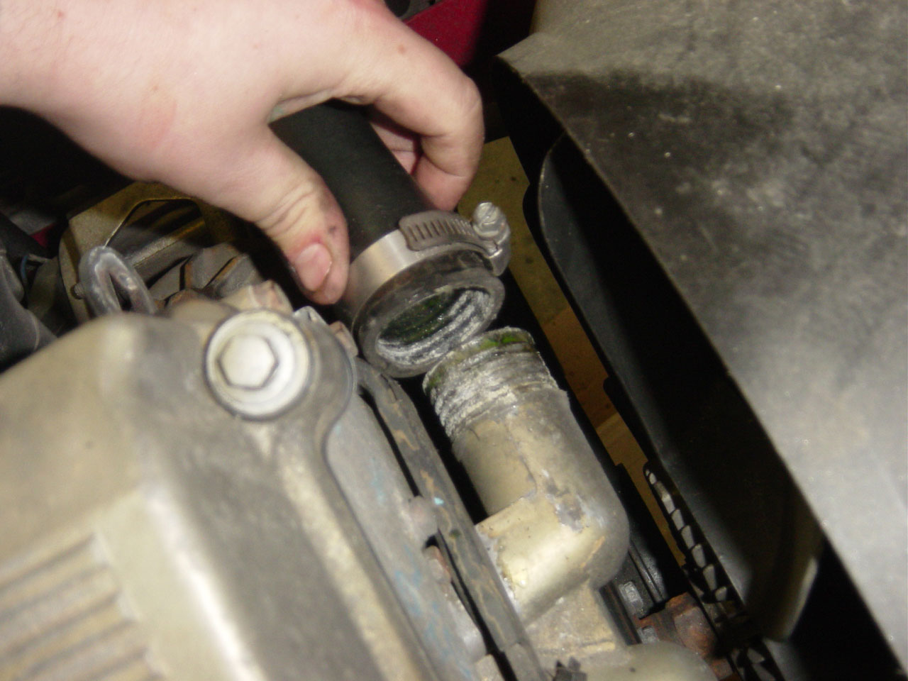 Unplug the other hose. Note that more coolant will escape so have a catch basin ready below the hoses. This job is messy. |