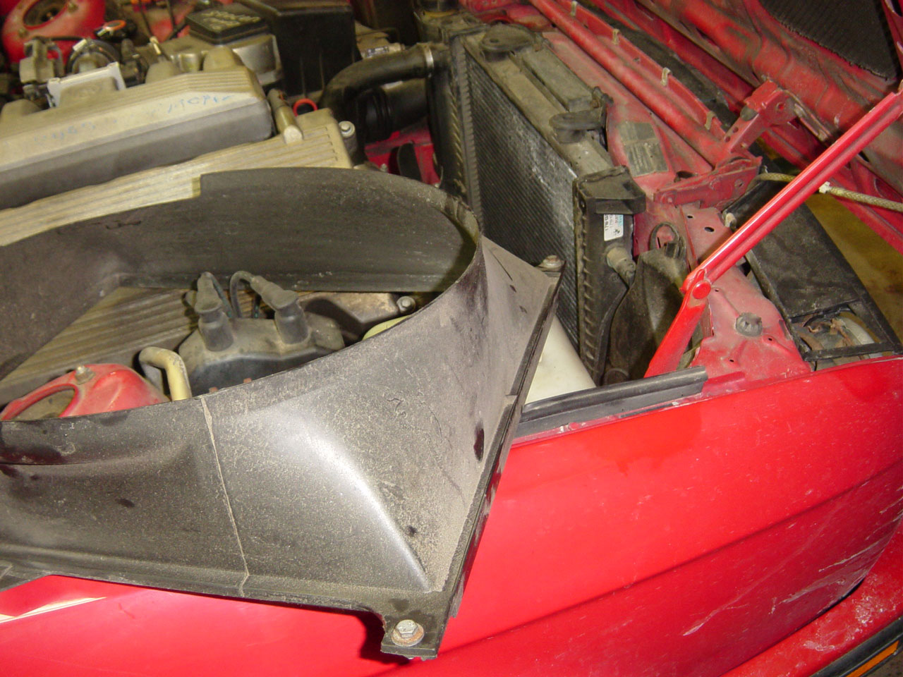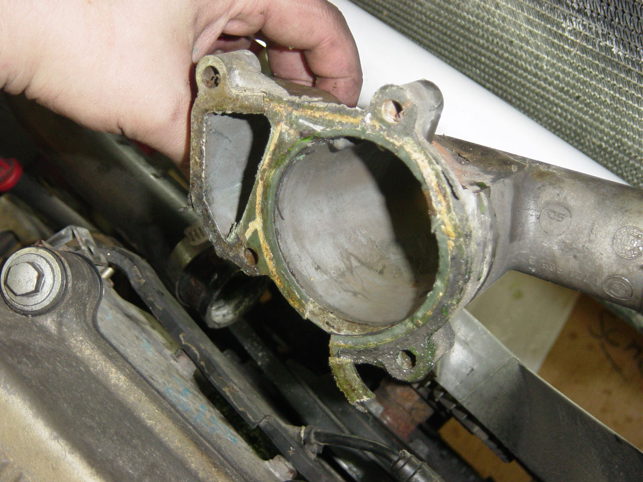 I then applied a new seal and managed to carefully angle the thermostat housing back into place while twisting it to avoid the fan blades that are always in the way. The use of the Permitex helps because it keep the gasket in place.